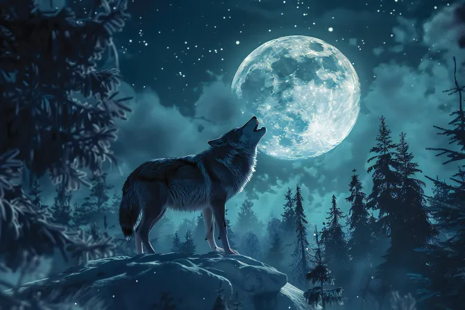 Wilk na zboczu góry wśród drzew i pełni księżyca.