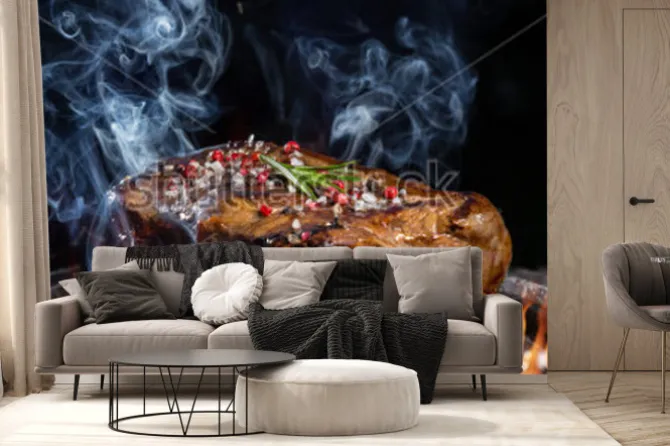Fototapeta: Wołowina stek na grillu w ogieniu z czarnym tłem