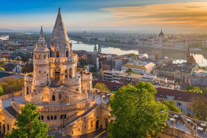 Wschód słońca z widokiem na wieżę w Budapeszcie.