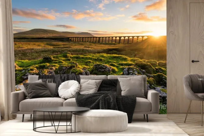 Fototapeta: Wspaniały złoty światło jako słońce ustawia za ribblehead wiaduktem