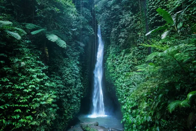 Wysoki wodospad w tropikalnej dżungli na Bali.