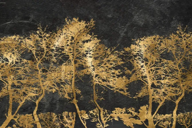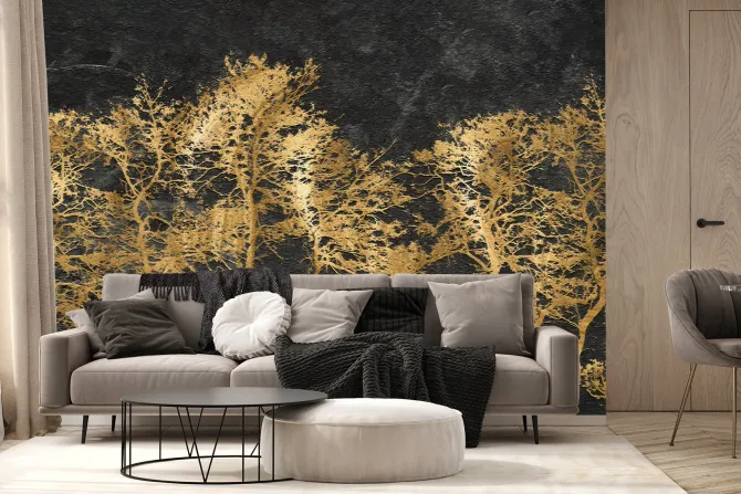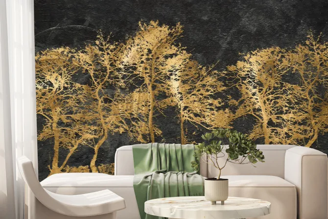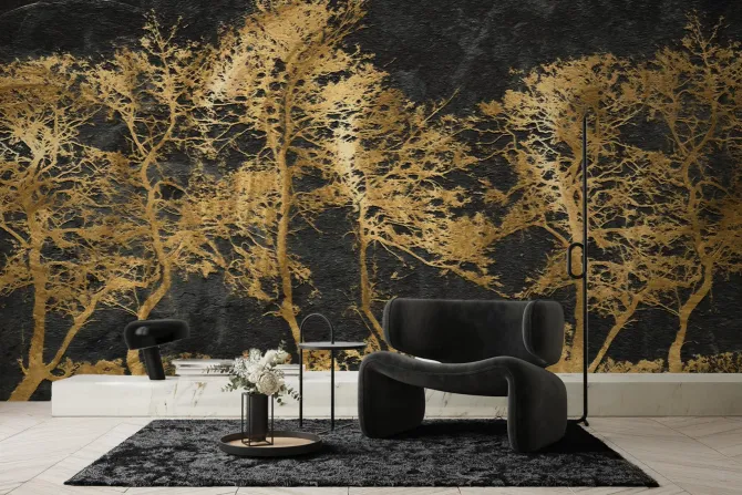Fototapeta: Zdobione złote drzewa ma czarnym murze