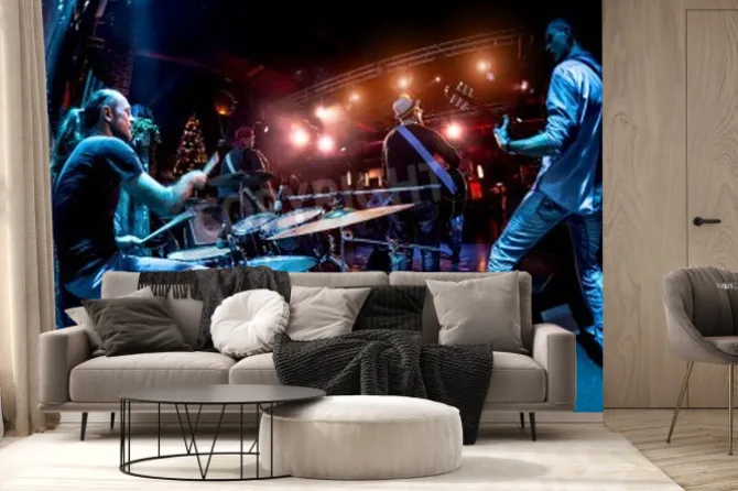 Fototapeta: Zespół wykonuje na scenie, koncert muzyki rockowej. ostrzeżenie