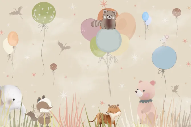 Fototapeta: Zwierzęta na łące z latającymi balonami