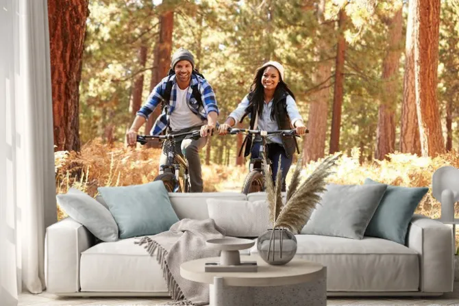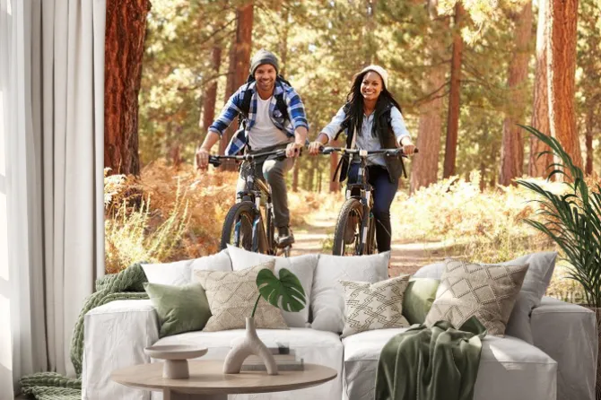 Naklejka: African american para na rowerze poprzez upadku woodland