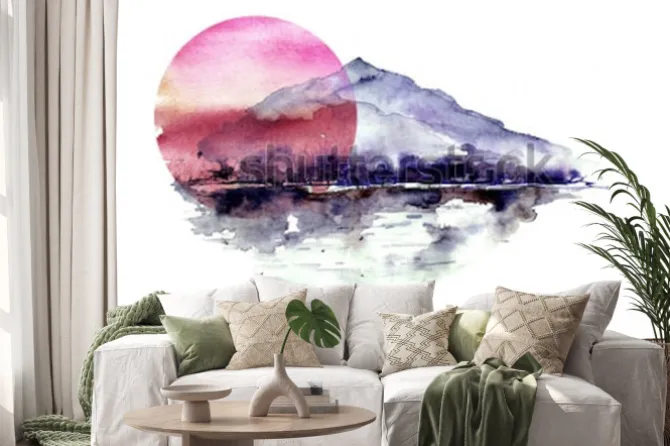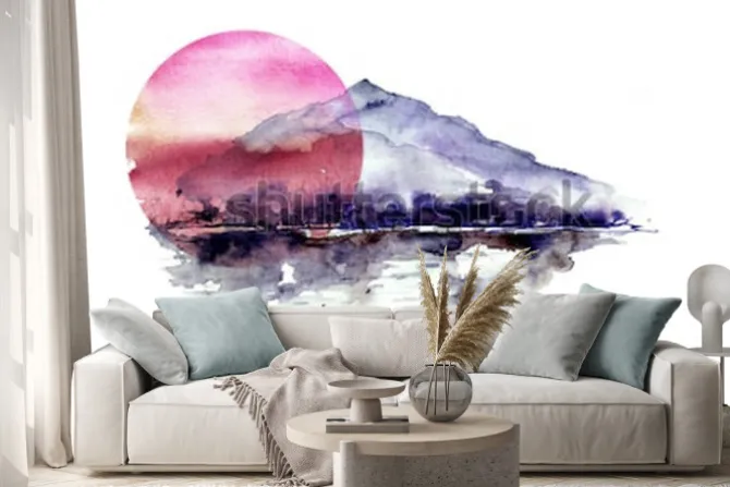 Akwarela górski krajobraz, niebieski, fioletowe góry, szczyt, sylwetka lasu, odbicie w rzece, czerwone słońce zachód słońca. Na białym tle odizolowane. Na białym tle odizolowane..