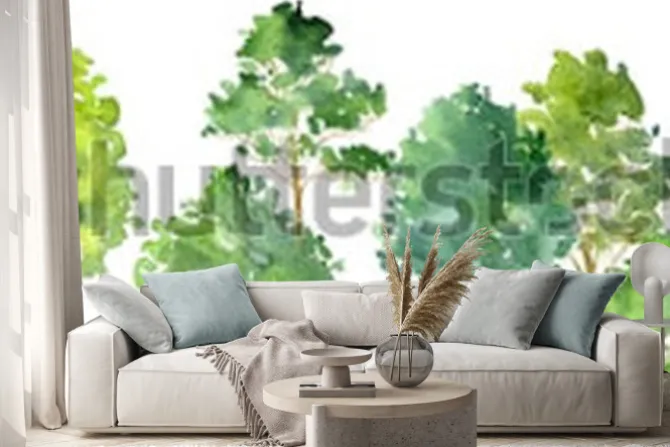 Naklejka: Akwarela krajobraz z drzew liściastych, sosny, krzewów i trawy,