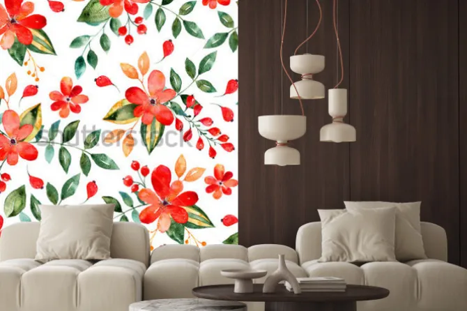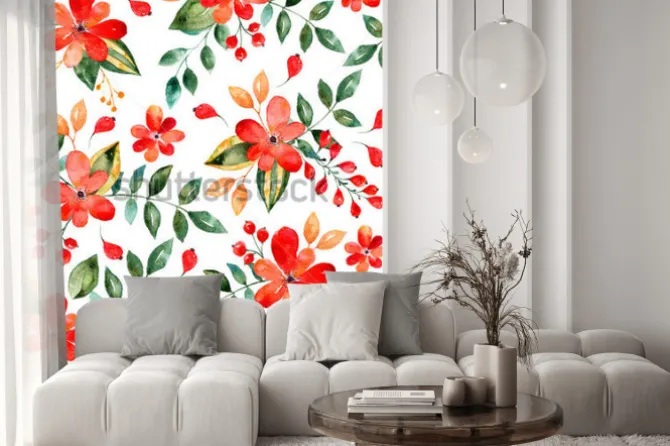 Naklejka: Akwarela kwiatowy wzór z czerwonych kwiatów i liści. kolorowa