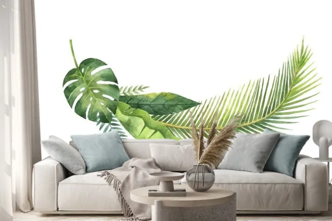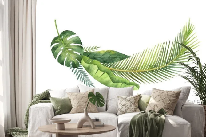 Naklejka: Akwarela wieniec tropikalnych liści i gałęzi samodzielnie na