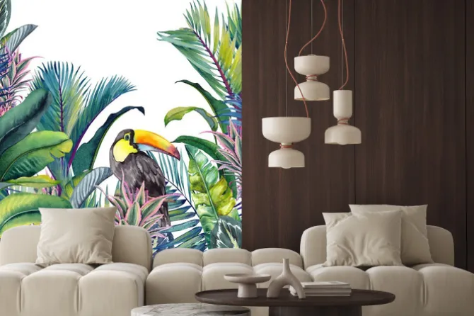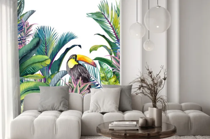 Naklejka: Akwarelowy tukan wśród gęstwiny tropikalnych liści