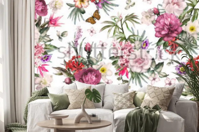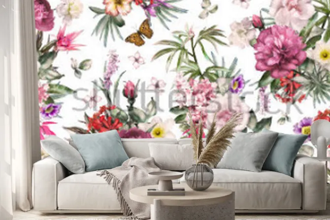 Naklejka: Bezszwowy wzór z kwiatami i egzotycznymi liśćmi na białym tle.