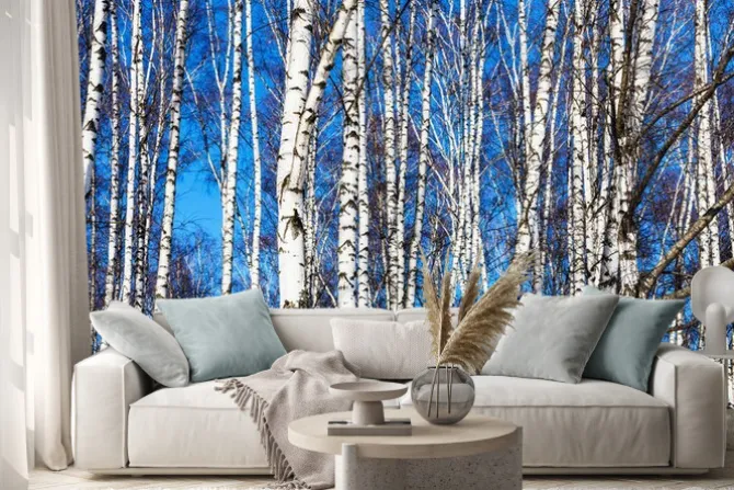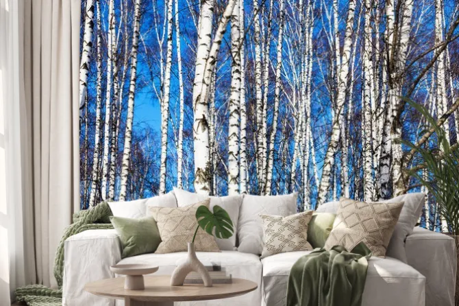 Naklejka: Białe brzozy i błękitne niebo