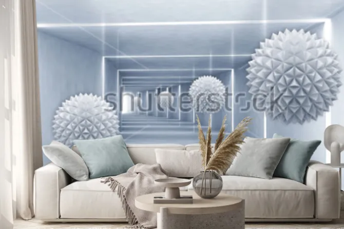 Naklejka: Białe geometryczne kule w futurystycznym tunelu 3d