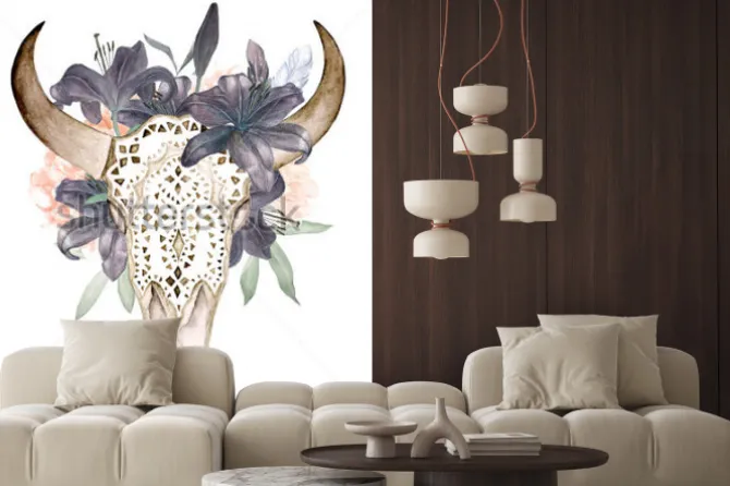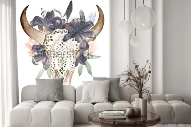 Białe tło z kwiatami i piórami na białym tle. Styl Boho. Ozdobne czaszki na czarnym tle, tapety, t-shirty, tekstylia, plakaty, karty, drukuje.