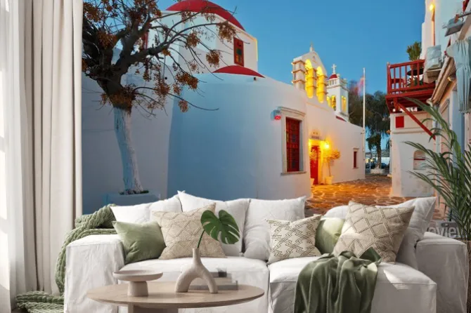 Naklejka: Bizantyjski kościół na ulicy miasta mykonos na wczesnym rankiem.