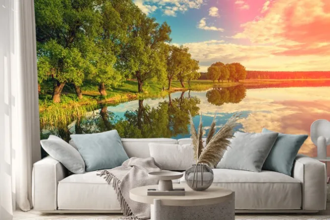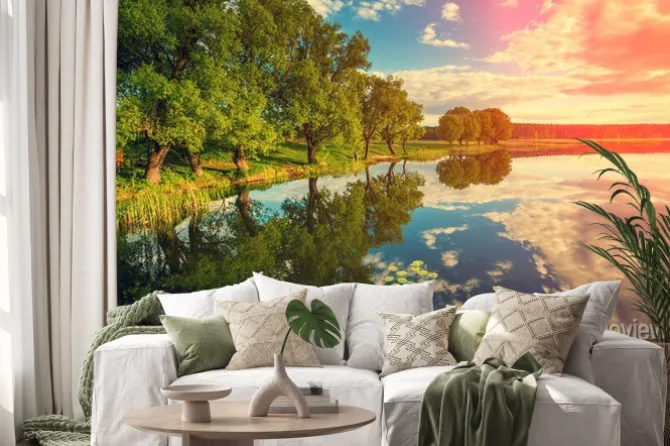 Naklejka: Brzegu rzeki z drzew o zachodzie słońca