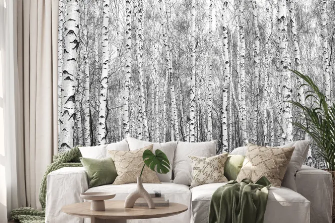Naklejka: Brzozowy las, czarno-białe zdjęcie
