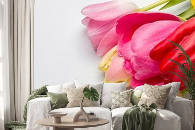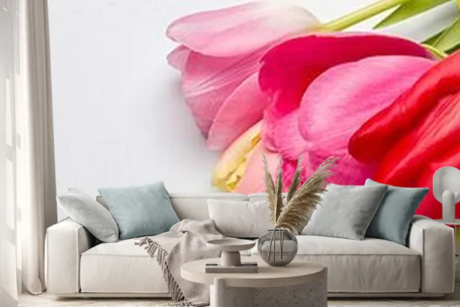 Naklejka: Bukiet wiosennych tulipanów zbliżenie na jasnoniebieskim tle,