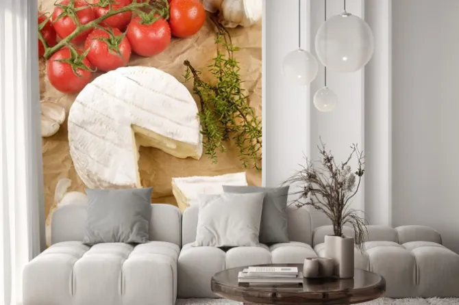 Naklejka: Camembert z czosnkiem, pieprzem, pomidorów i tymianku na brązowym
