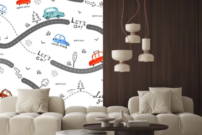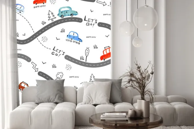 Naklejka: Kolorowe samochody na drodze z napisami