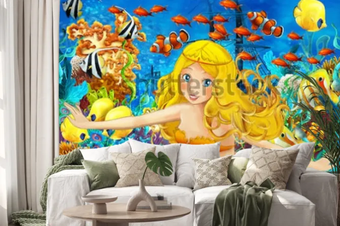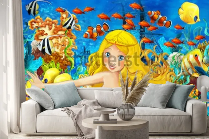 Naklejka: Kreskówka ocean i syrenka w podwodnym królestwie pływa z rybami