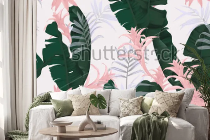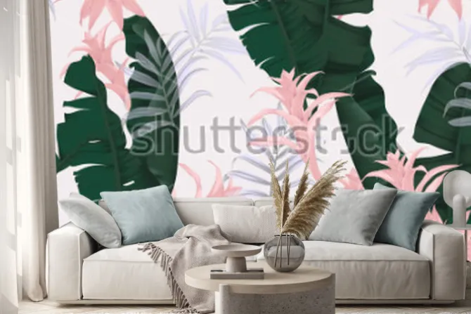 Naklejka: Kwiecisty bezszwowy wzór, zieleni bananowi liście, różowa bromeliaceae