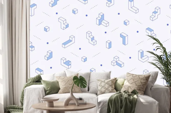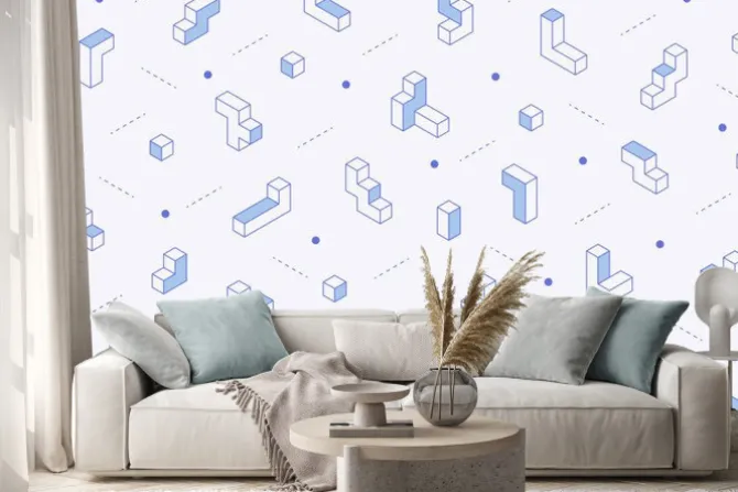 Pieces of three-dimensional tetris blocks are arranged in an isometric grid. Simple pattern design template..