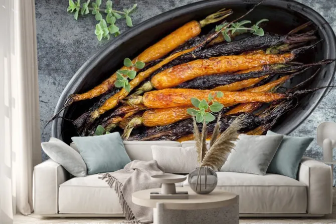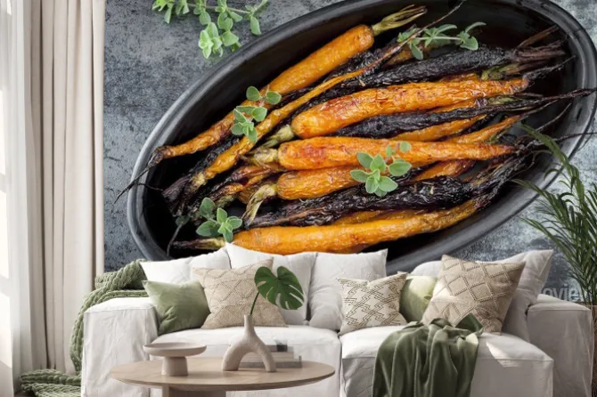 Naklejka: Pieczone dziecko marchew poziome overhead view