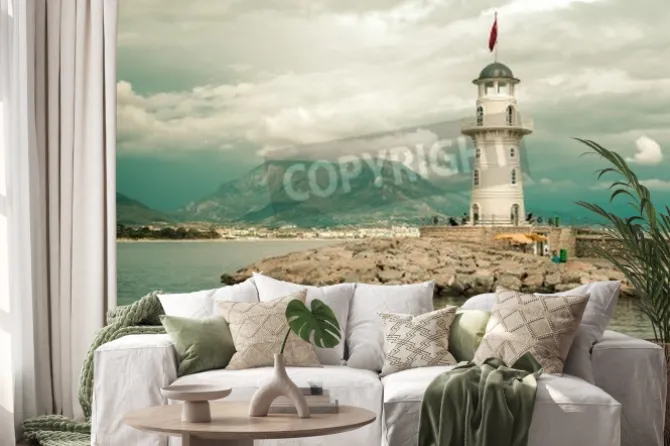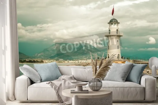 Piękny krajobraz przyrody z gór zakresie, pochmurne niebo i latarnia morska w porcie Alanya, Turcja.