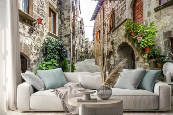 Naklejka: Piękny widok starych tradycyjnych domów i idyllicznym alejki