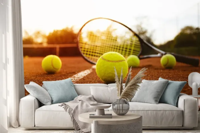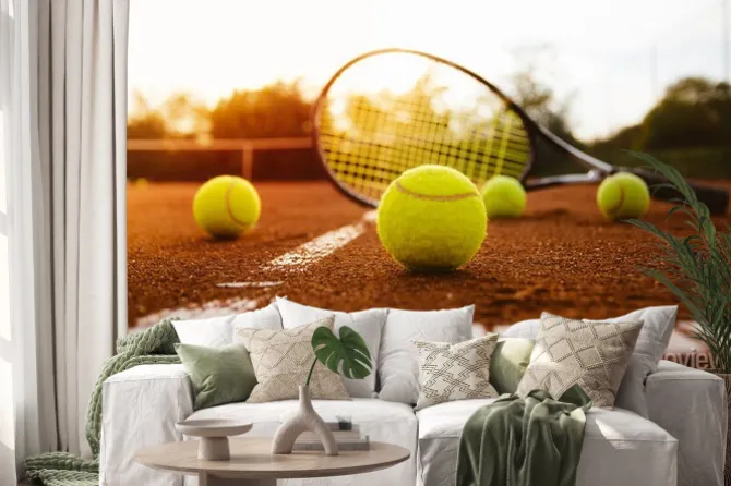 Naklejka: Piłki i rakieta do tenisa na korcie