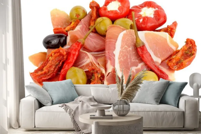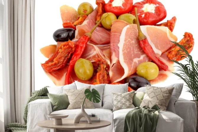 Naklejka: Plastry szynki serrano z oliwkami i papryką