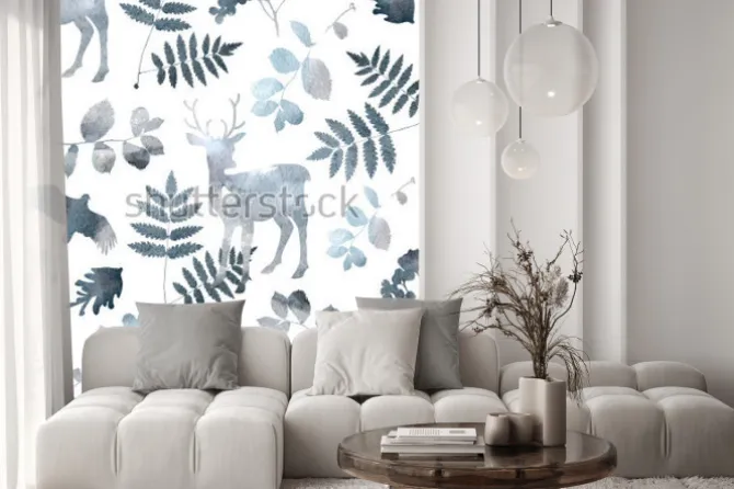 Naklejka: Północnej lasu wzór z jelenia, ptaki, elementy liści. akwarela