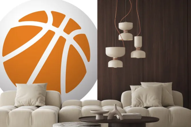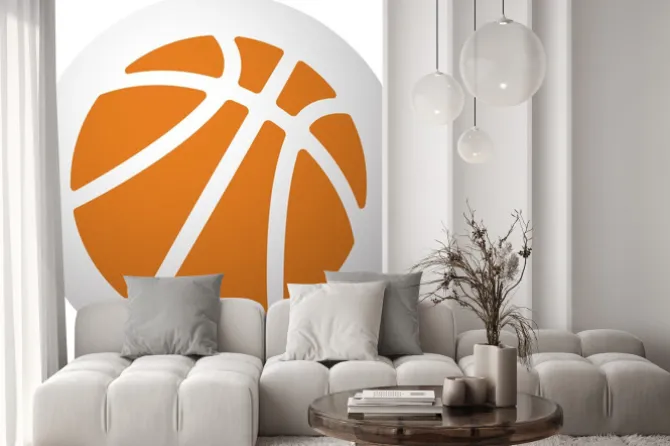 Naklejka: Pomarańczowa ikona koszykówka na kuli na białym tle