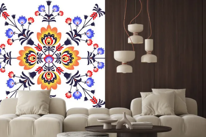 Naklejka: Pomarańczowo-niebieski wzór ludowy w kwiaty