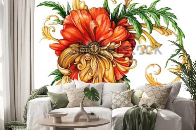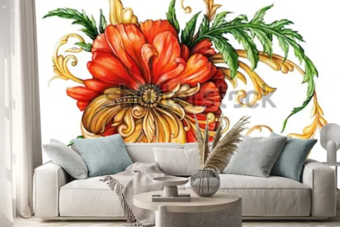 Naklejka: Pomarańczowy mak ze złotymi zwojami 1