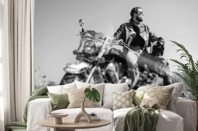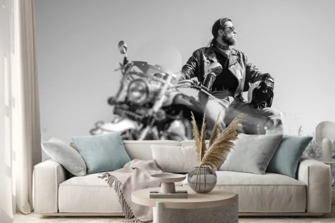 Portret młodego mężczyzny z brodą siedzący na jego krążownika motocyklu i patrząc na słońce. Mężczyzna ma na sobie skórzaną kurtkę i niebieskie dżinsy. Niski punkt widzenia. Plandeka obiektyw efekt ro.