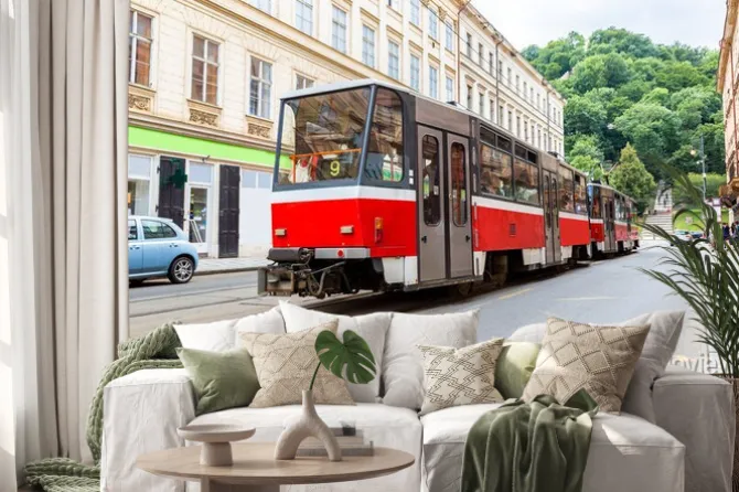 Naklejka: Praga szczegółowo czerwone tramwaj, republika czeska