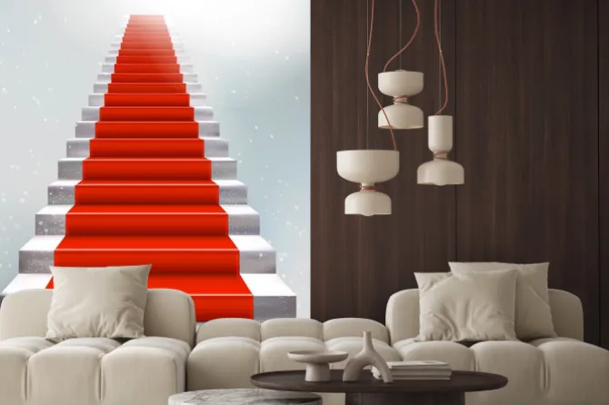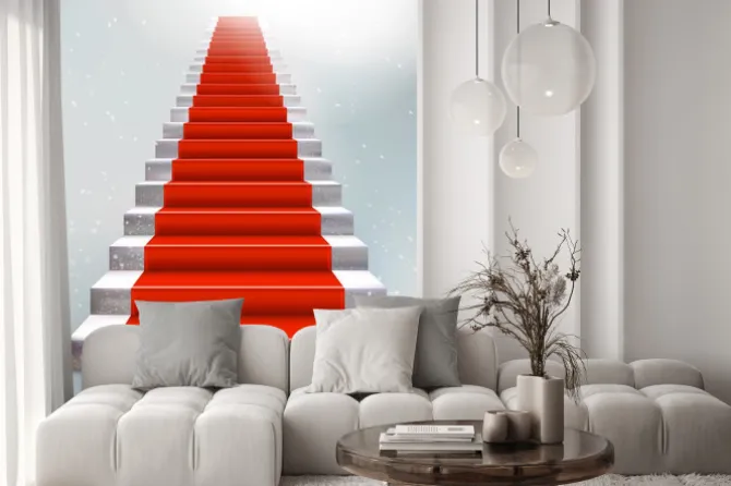 Naklejka: Realistyczne kamienia drabina z czerwonego dywanu i światła