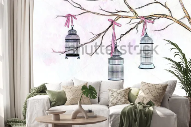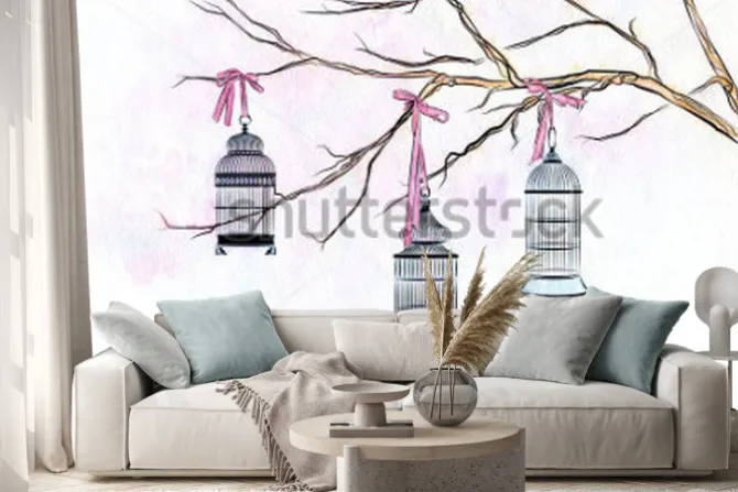 Naklejka: Ręcznie opracowane akwarela trzy klatki ptaków na gałęzi drzewa