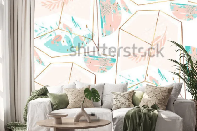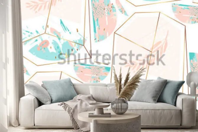 Ręcznie rysowane wektor streszczenie artystyczny geometryczny wzór z kryształowe terrarium i brunch w kolorach złota, pastel i tiffany niebieski na białym tle. Poligonalny artystyczny..