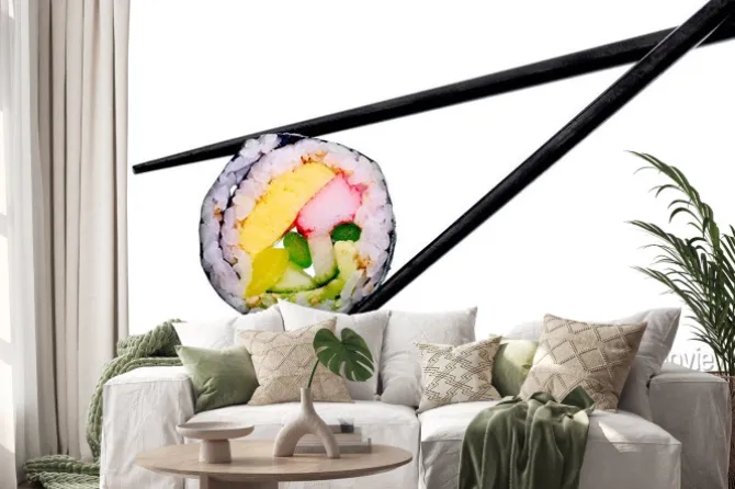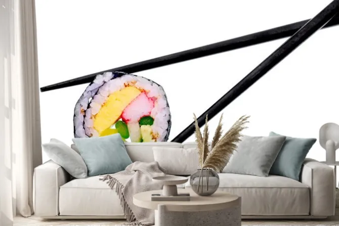 Naklejka: Roll sushi z czarnymi pałeczkami na białym tle