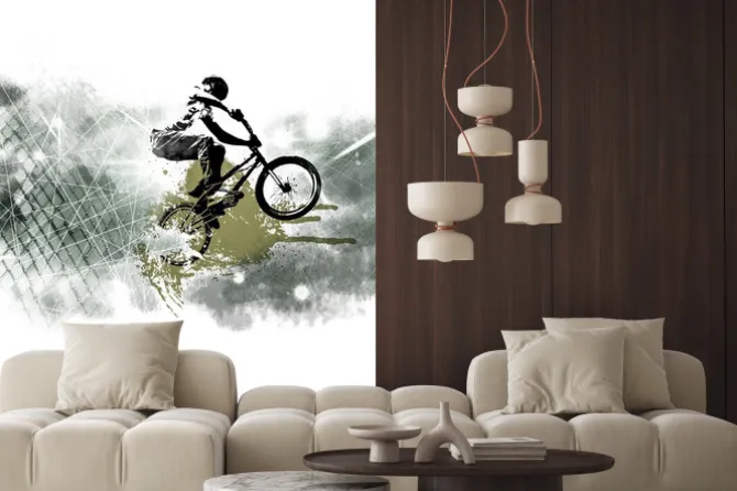 Rowerzysta w wyskoku na abstrakcyjnym tle.
