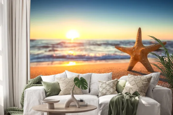 Naklejka: Rozgwiazdy na plaży o wschodzie słońca