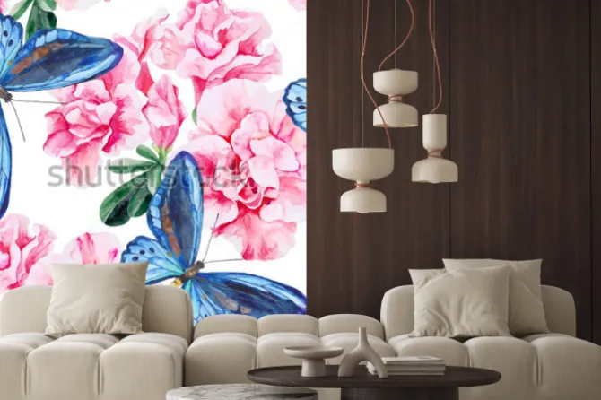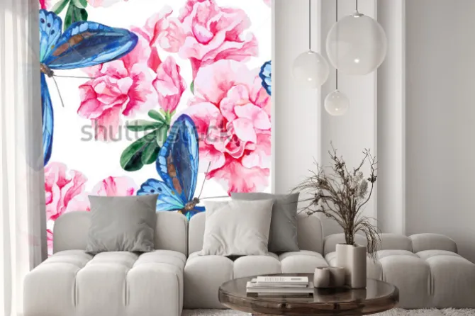 Naklejka: Różowa azalia i niebieskie motyle. bez szwu, ręcznie malowany,