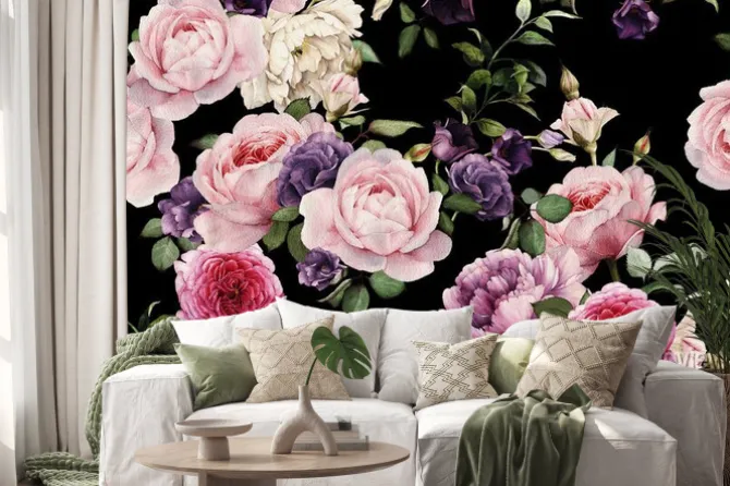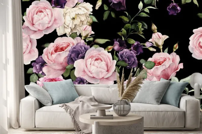 Naklejka: Różowe i fioletowe kwiaty na czarnym tle