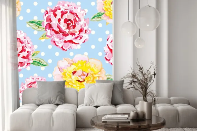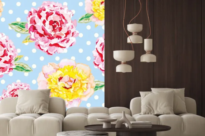 Naklejka: Różowe i żółte piwonie na jasnoniebieskim polka dot tle. akwarela