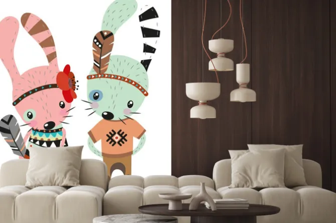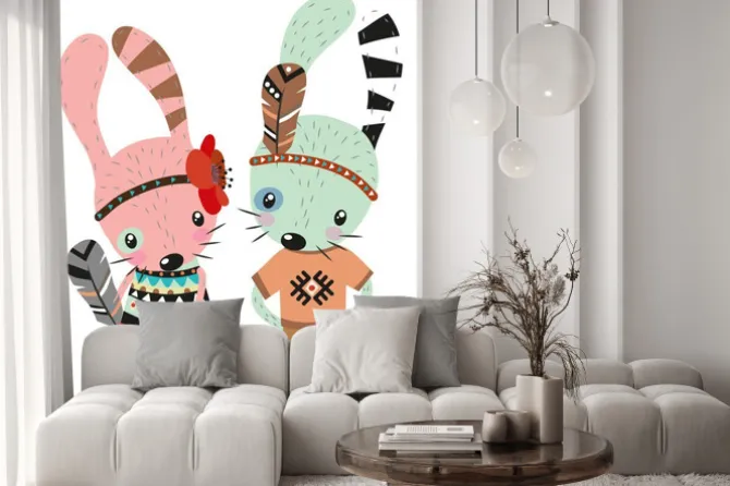 Naklejka: Różowy i miętowy królik z piórami