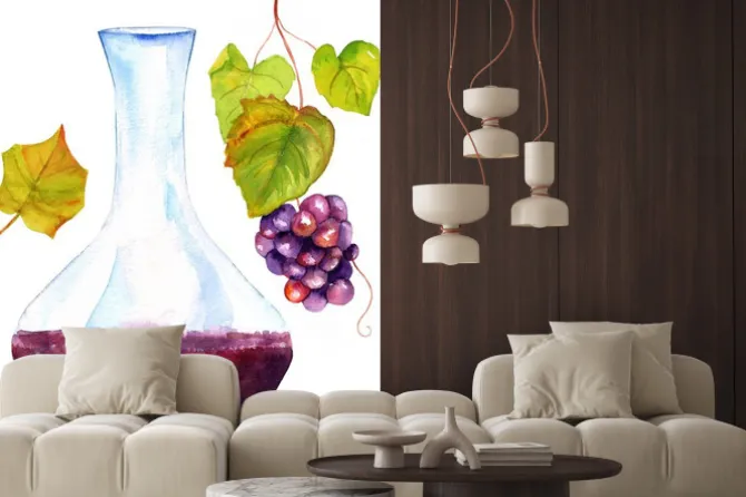 Naklejka: Rysunki akwarela z karafki do wina, liści winorośli i winogron,