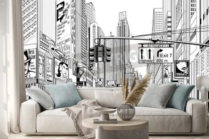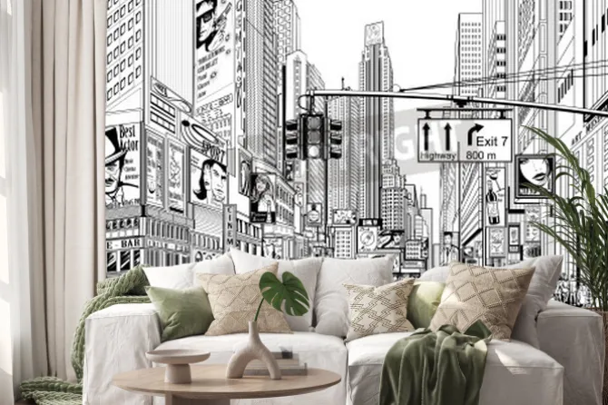 Naklejka: Rysunkowa panorama miasta nowy jork w czerni i bieli
